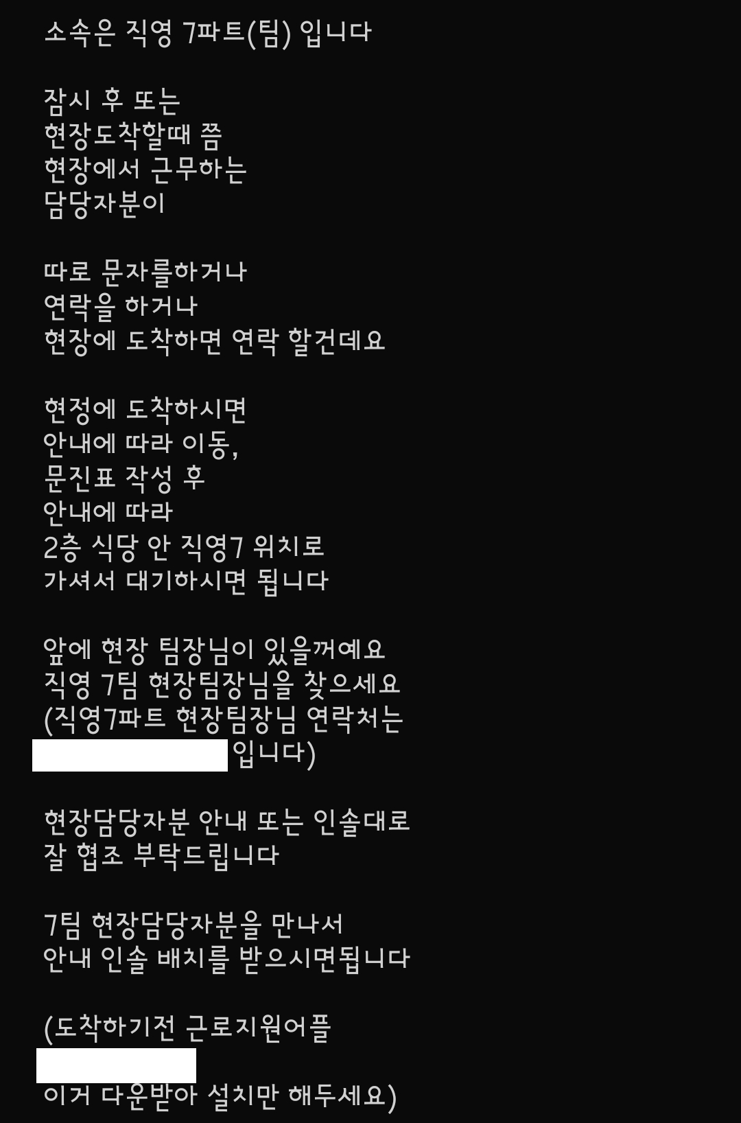 도대체 내가 왜 그랬는지는 모르겠지만 하루만 해보기로 결심을 하고 채용담당자에게 문자를 보냈다. 이름/나이/지역/성별/희망근무일 등을 보내주니 다음과 같이 안내사항을 길게 보내줬다.