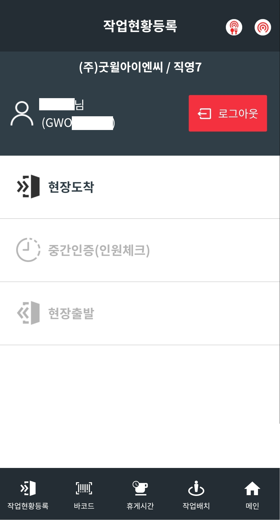 여튼 청소까지 다 마치고 겉옷 챙겨서 입구로 갔다. 그리고 건물을 나가기 전에 스마트폰 어플으로 퇴근도장을 찍는다. 안 찍으면 돈 안준다. 아래 사진은 글 쓰면서 찍은거라 '현장출발' 버튼이 비활성화 되어있는데 작업장에 가면 끝나는 시간에 저게 활성화 되어있다. 만약 깜박하고 나와서 버스에서 찍으려고 하면 안될거다. 작업장 내에 있는 비콘의 신호거리 내에 있어야 찍힌다. 그러니까 꼭 잊지말고 퇴근도장 찍고 나와야 한다.