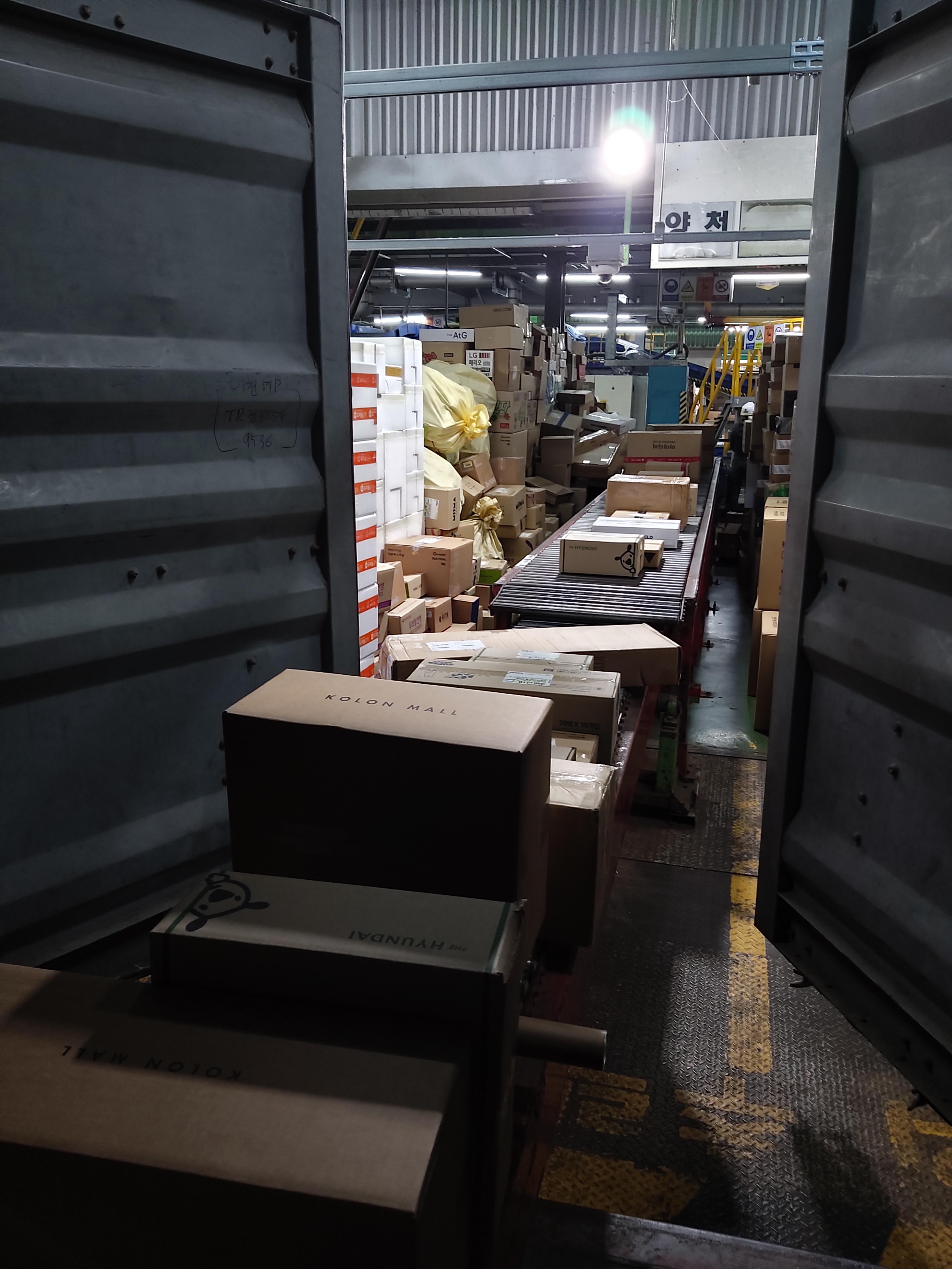 진짜 헬로키티 휴지박스 저거 x같은거 부피도 커서 쌓을 공간 다 잡아먹는다. 그러다보니 계속 뒤쪽 공간에 쌓아야해서 움직이는 동선이 길어지니 체력이 더 빨리 떨어졌다. 이거 찍은 후로도 한참 동안 차가 안 들어와서 나중에는 레일 옆에 통로라고 만들어놓은 공간에도 박스가 다 찼다. 쌓으면서도 다시 레일에 올려놓을 생각 하니까 진짜 다 터뜨려버리고싶었다. 특히 김치, 음료수, 건조대 ㅈ같이 무겁다