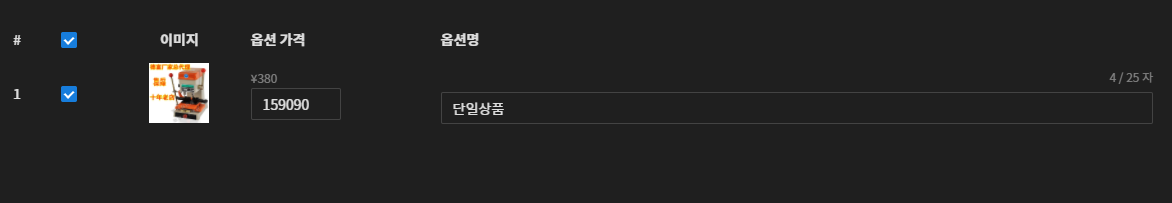 진짜 이런건 도대체 어떻게 요약해야 할 지 보기만 해도 한숨만 나온다. 옵션 하나에 250원도 아니고 이런거 수십개 수정해서 업로드 시켜야 상품 하나 업로드 한 거다. 전기자전거(킥보드)나 가구 같은 품목에서 이런 옵션이 굉장히 많이 나온다. 그런거 작업 할 때 마다 한숨 푹푹 쉬면서 작업한다. 가끔 다음과 같이 옵션이 하나인 단일상품이 나오는데 진짜 너무 고마워서 눈물이 날 지경이다.