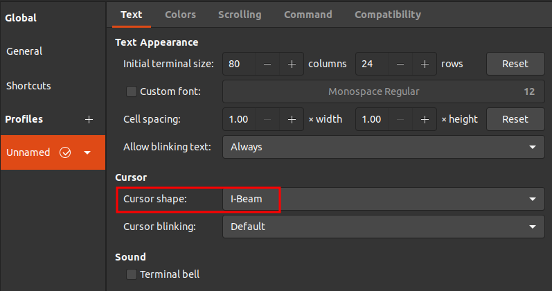 Profile 선택 > Text > Cursor > Cursor Shape > I-Beam