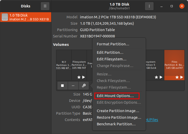 exFAT 파티션을 선택하고 기어 모양 버튼을 클릭해 'Edit Mount Options...' 메뉴를 선택한다.
