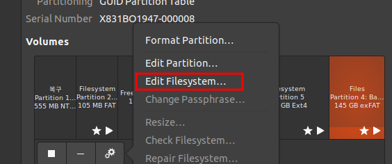 'Mount Point' 텍스트박스를 수정하기 전에 'Identify As'의 옵션을 를 먼저 선택해준다. 어떤 것을 선택하든지 크게 중요하지는 않지만 나는 'by-label'을 선택했다(파티션을 가장 쉽게 특정할 수 있는 것 같아서). 만약, 파티션의 레이블을 아직 설정하지 않았거나 바꾸고 싶으면 'Edit Filesystem...' 메뉴에서 수정할 수 있다.