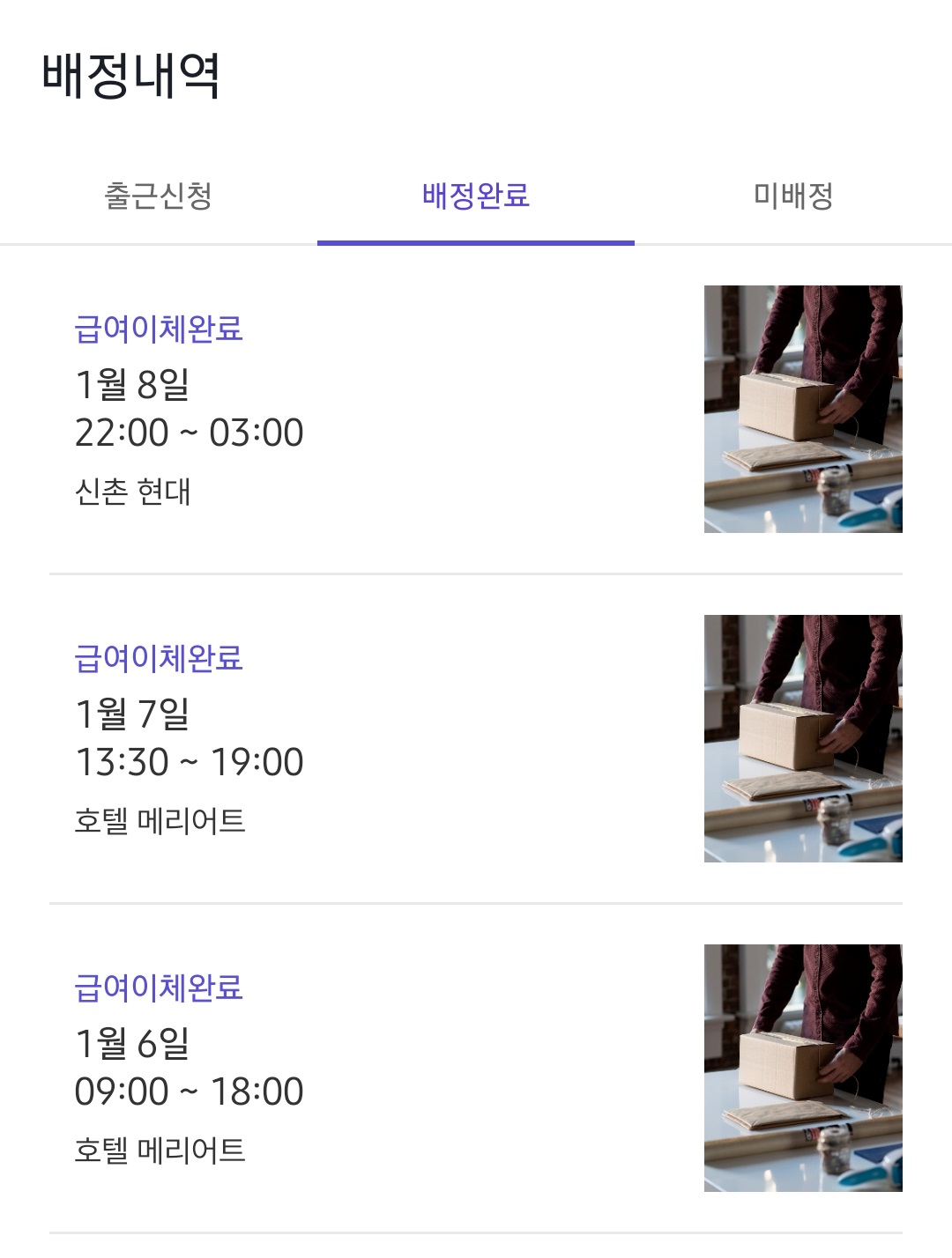 나는 다음과 같이 올해(2023년) 1월에 총 3번 근무배정을 받아 알바를 하고 왔다.