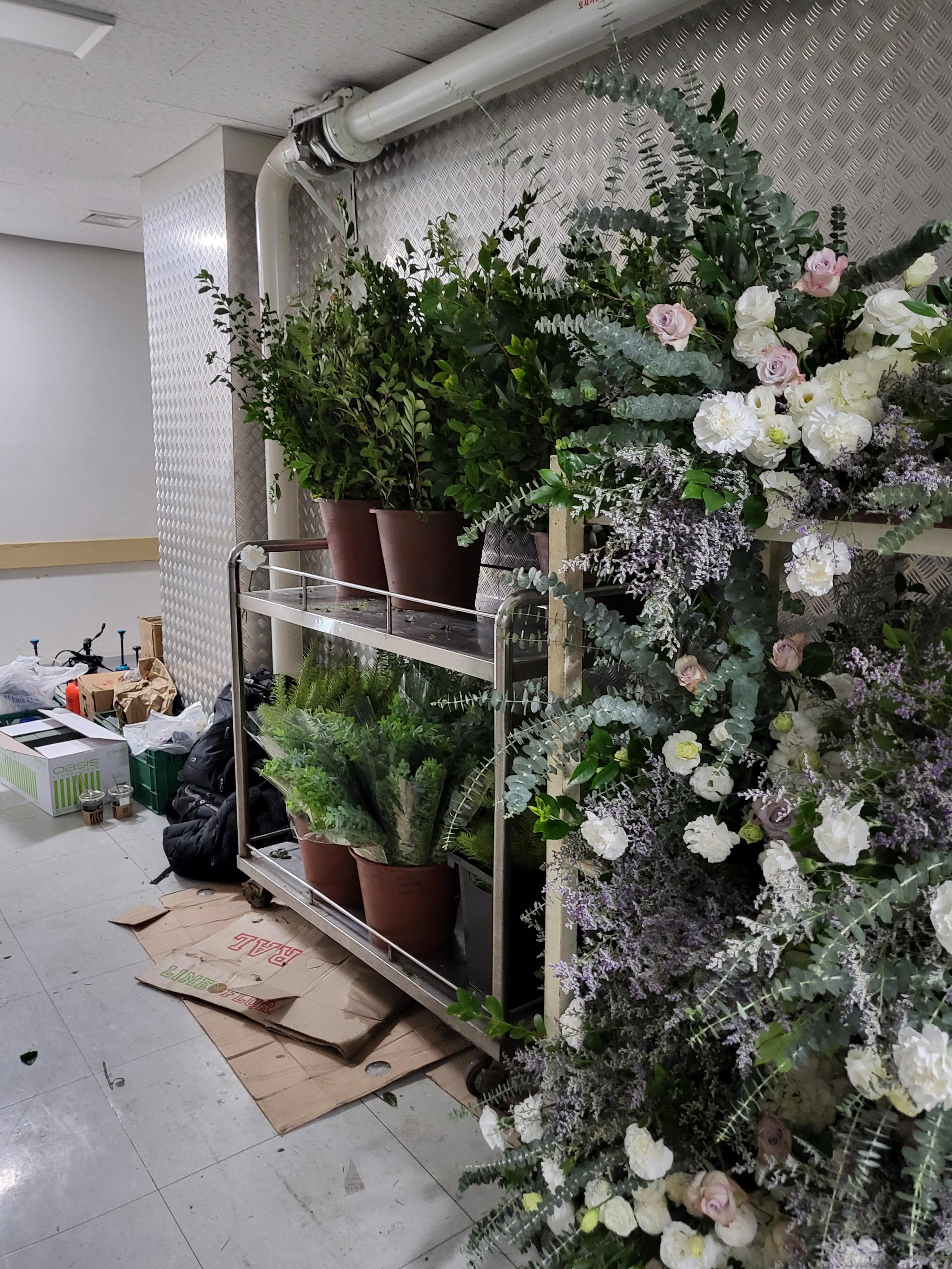 생화가 든 수레를 막 옮기다 보니까 물도 떨어지고 쓰레기도 엄청 나오고... 겉으로 보이는 결혼식은 화려한데 그 뒤쪽은 엄청 바쁘고 힘들었다. 조화도 아니고 생화이다보니 무게가 엄청나서 매우매우 힘들었다.