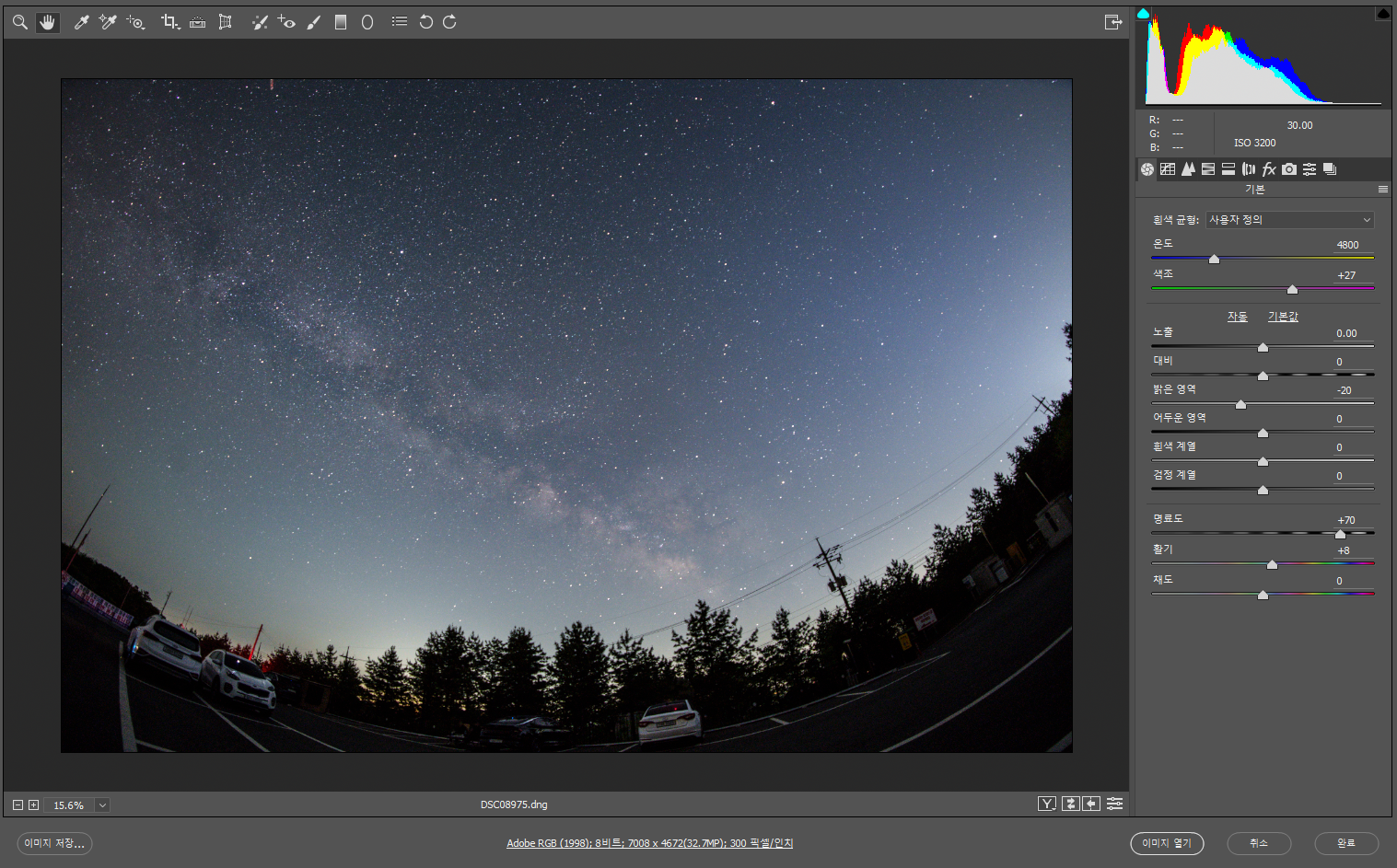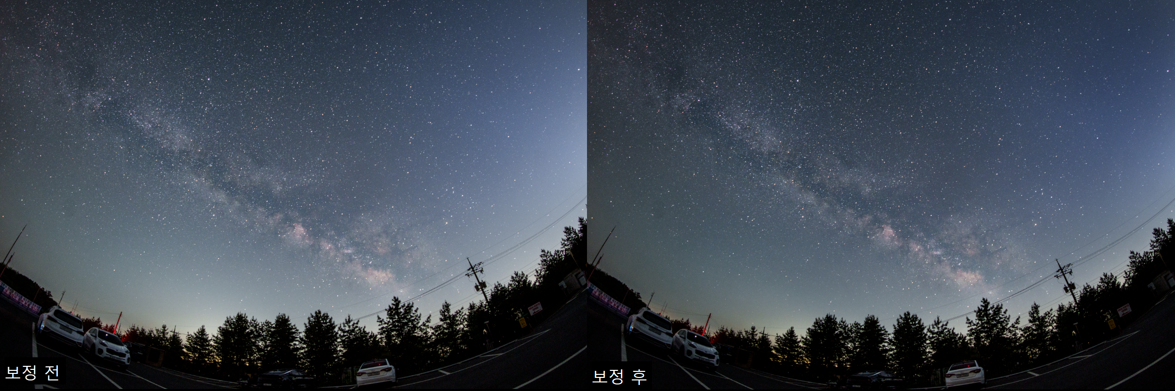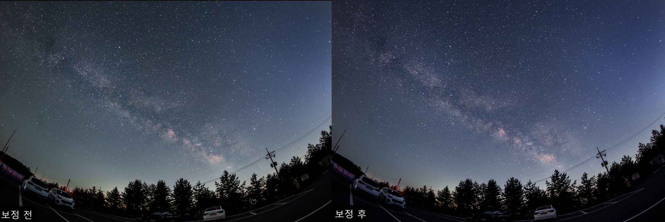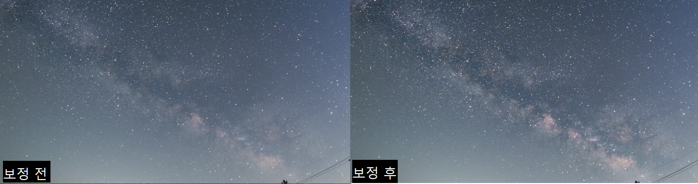 은하수 주변부 칠해주어 은하수가 돋보이게 하기, 광해가 있는 부분 등 너무 밝은 부분 칠해주기